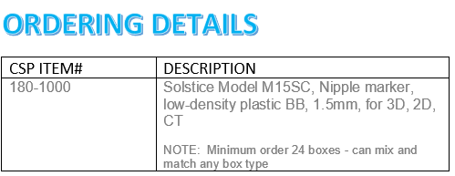 Xact M15SC nipple markers feature a plastic 1.5mm diameter BB perfect for 3D tomo. They are easy to apply, adhere well, and are artifact-free. For plain films, extremities, and mammography, please also consider markers M15S and M20S.