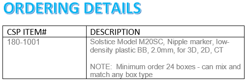 Xact M20SC nipple markers feature a plastic 2.0mm diameter BB perfect for 3D tomo. They are easy to apply, adhere well, and are artifact-free. For plain films, extremities, and mammography, please also consider markers M15S and M20S.