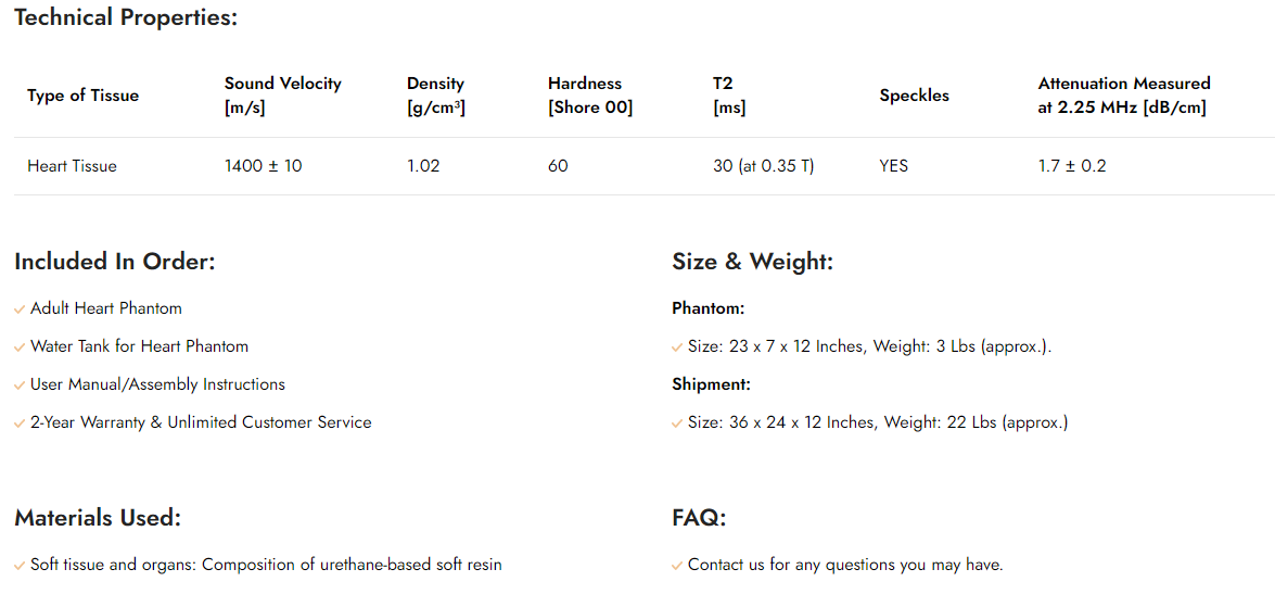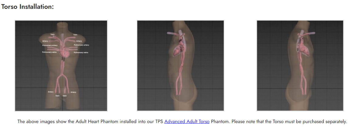 The Adult Heart Phantom is a realistic simulator of a healthy-adult human heart. The phantom is compatible with X-Ray/CT, Ultrasound, and MRI. This product has a wide range of applications as it also has the potential to support beating functionality and generate life-like motions. Some of its uses and applications include transesophageal and transthoracic echocardiograms, ultrasound-navigated endoscopies, catheter insertion under ultrasound probes, and other cardio-based research and development studies.