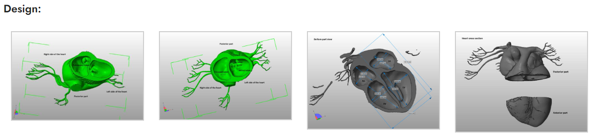 The phantom is built from a realistic, life-like, synthetic material to mimic the acoustical, physical, and mechanical properties of real biological tissues. Using 3D printing technology and synthetic material, the heart phantom is built to reflect exact anatomical structures. The phantom is fully customizable and able to suit a wide variety of bio-medical projects.