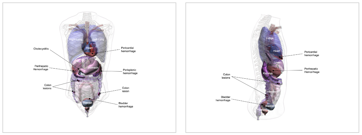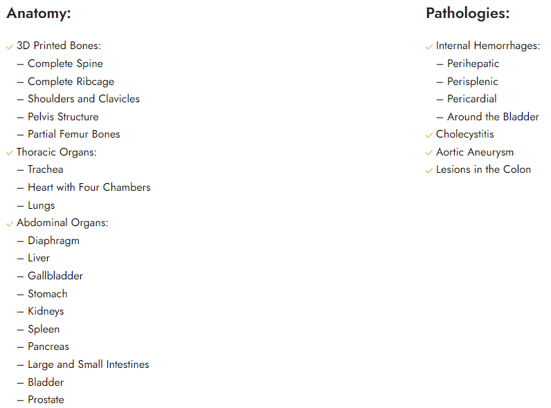 The phantom is comprised of 3D-printed bones. It also includes organs made from ultrasound-compatible tissue-mimicking material. Pathologies included in this phantom make it a great tool for FAST training.