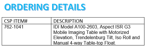 IDI Model A100-2603, Aspect ISR G3 Mobile Imaging Table with Motorized Elevation, Trendelenburg Tilt, Iso Roll and Manual 4-way Table-top Float.