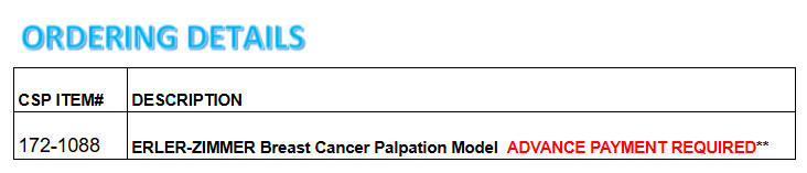 Life size model of a female breast made of tissue-like material. The model includes a palpable lump as well as a mastopathy.