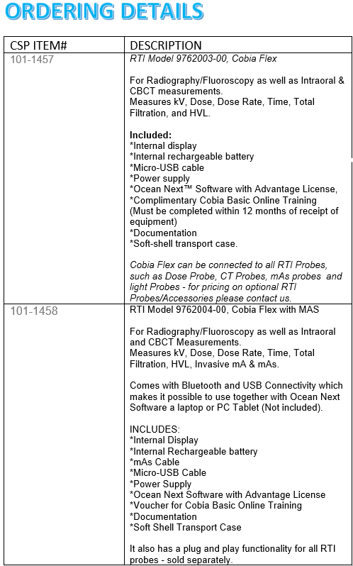 For Rad/Fluoro as well as Intraoral and CBCT measurements, RTI Cobia FLEX R/F offers you the convenience to make your X-ray Quality Control as quick and accurate as possible.