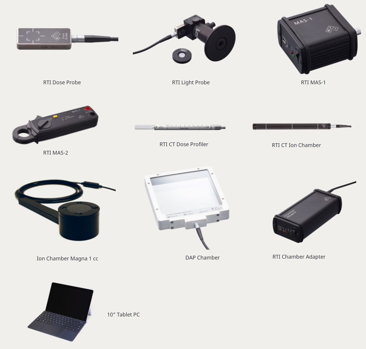The meter can be connected to all RTI probes available, such as dose probes, CT probes, mAs probes, and light probes.