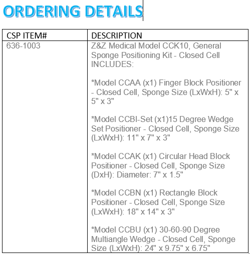 Closed Cell Sponges are made from a lightweight, radiolucent, non-porous foam. The perfect solution for any positioning need! These positioning sponges are entirely fluid resistant, easy to clean and extremely durable! Featured in a non-coated, premium charcoal grey color.