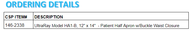 A patient half-apron with a 2” belt and optional Buckle (-B) or VELCRO® (-V) waist closure to provide adjustability where required. Available individually or as a set of 4, with or without a wall- mounted rack. When ordering, please choose the code with either a -B or a -V at the end (Example: Choose PED1-B to order a PED1 with a buckle waist closure).