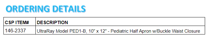 A patient half-apron with a 2” belt and optional Buckle (-B) or VELCRO® (-V) waist closure to provide adjustability where required. Available individually or as a set of 4, with or without a wall- mounted rack. When ordering, please choose the code with either a -B or a -V at the end (Example: Choose PED1-B to order a PED1 with a buckle waist closure).
