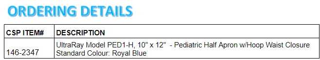 A patient half-apron with a 2” belt and optional Buckle (-B) or VELCRO® (-V) waist closure to provide adjustability where required. Available individually or as a set of 4, with or without a wall- mounted rack. When ordering, please choose the code with either a -B or a -V at the end (Example: Choose PED1-B to order a PED1 with a buckle waist closure).