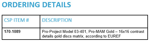 Contrast details mammography phantom according to European Protocol for quality assurance in Digital Mammography. It may be used to determine if mammographic images indicate objects with very low contrast and very small diameter, to find out the optimum exposure technique, or to compare image quality at various object thicknesses by variation of the amount of PMMA thickness.