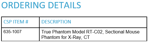 Sectional Mouse Phantom for X-RAY CT and MRI is an anatomically correct phantom that is sliced into segments and is used for medical imaging research and development, testing and calibrating purposes.