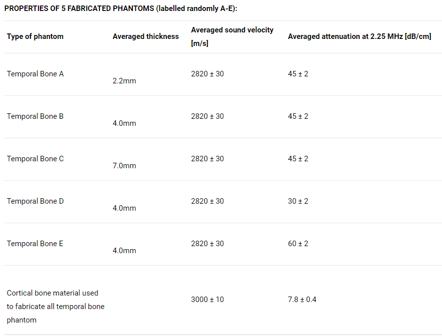 · Realistic thickness, spatial variation and ratio of diploe · Size and dimensions corresponding to the temporal window (approx. 8×8 cm) · Various porosity (attenuation): approx. 30, 45, 60 dB/cm @2.25 MHz · Various thickness (2.2mm, 4.0mm, 7.0mm) |