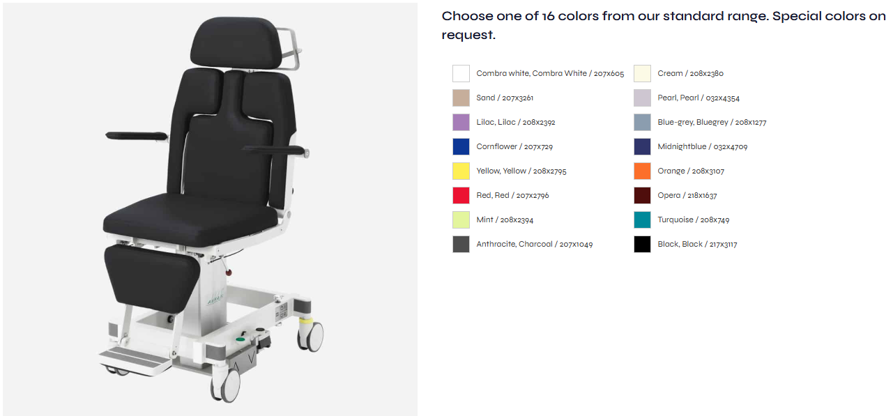 The built-in footrest allows patients to get in and out of the ak5010 MBS breast diagnostic chair with ease. The AKRUS upholstery in handcrafted quality ensures a comfortable sitting and lying experience for the patient. A large selection of colors allows the chair to be matched to the clinic or practice environment, and there is also a choice of two upholstery variants. The ak5010 MBS breast diagnostics chair is delivered fully assembled and the use of high-quality components ensures many years of reliable use when used as intended. In the event of a service request, authorized medical technology dealers are available.